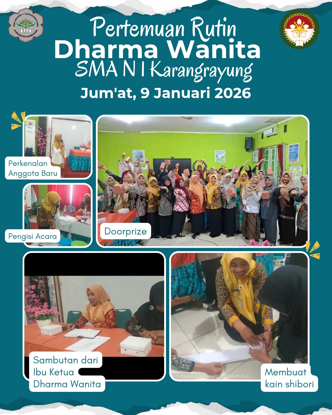 Jumat/ 9 Januari 2026 telah dilaksanakan pertemuan rutin Dharma Wanita Persatuan SMA Negeri 1 Karangrayung. Pada kesempatan ini, hadir istri dari Bapak Kepala Sekolah sebagai Ketua DWP, yaitu Ibu Ina Purwanti. Kegiatan dihadiri oleh seluruh anggota DWP SMA Negeri 1 Karangrayung. Kegiatan diawali dengan menyanyikan lagu Indonesia Raya, dilanjutkan doa, sambutan dari ketua DWP, laporan-laporan, dan diakhiri dengan kegiatan inti, yaitu pelatihan membuat kain batik dengan teknik Celup Ikat. Tutor dari pelatihan ini, yaitu Ibu Widya Ariyanti. Semua anggota DWP nampak sangat senang dan menikmati selama kegiatan.