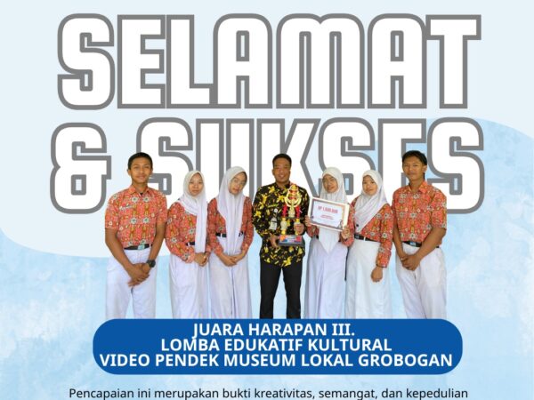 Juara Harapan III Lomba Video Pendek dalam Rangka Lomba Edukatif Kultural DAK Museum Lokal Kabupaten Grobogan tahun 2025 yang diselenggarakan Dinas Pemuda Olahraga, Kebudayaan, dan Pariwisata Kabupaten Grobogan.
