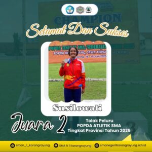 Kami ucapkan selamat kepada Susi, siswa SMA Negeri 1 Karangrayung, atas prestasinya meraih Juara 2 dalam cabang olahraga Tolak Peluru pada ajang POPDA tingkat Provinsi!