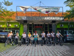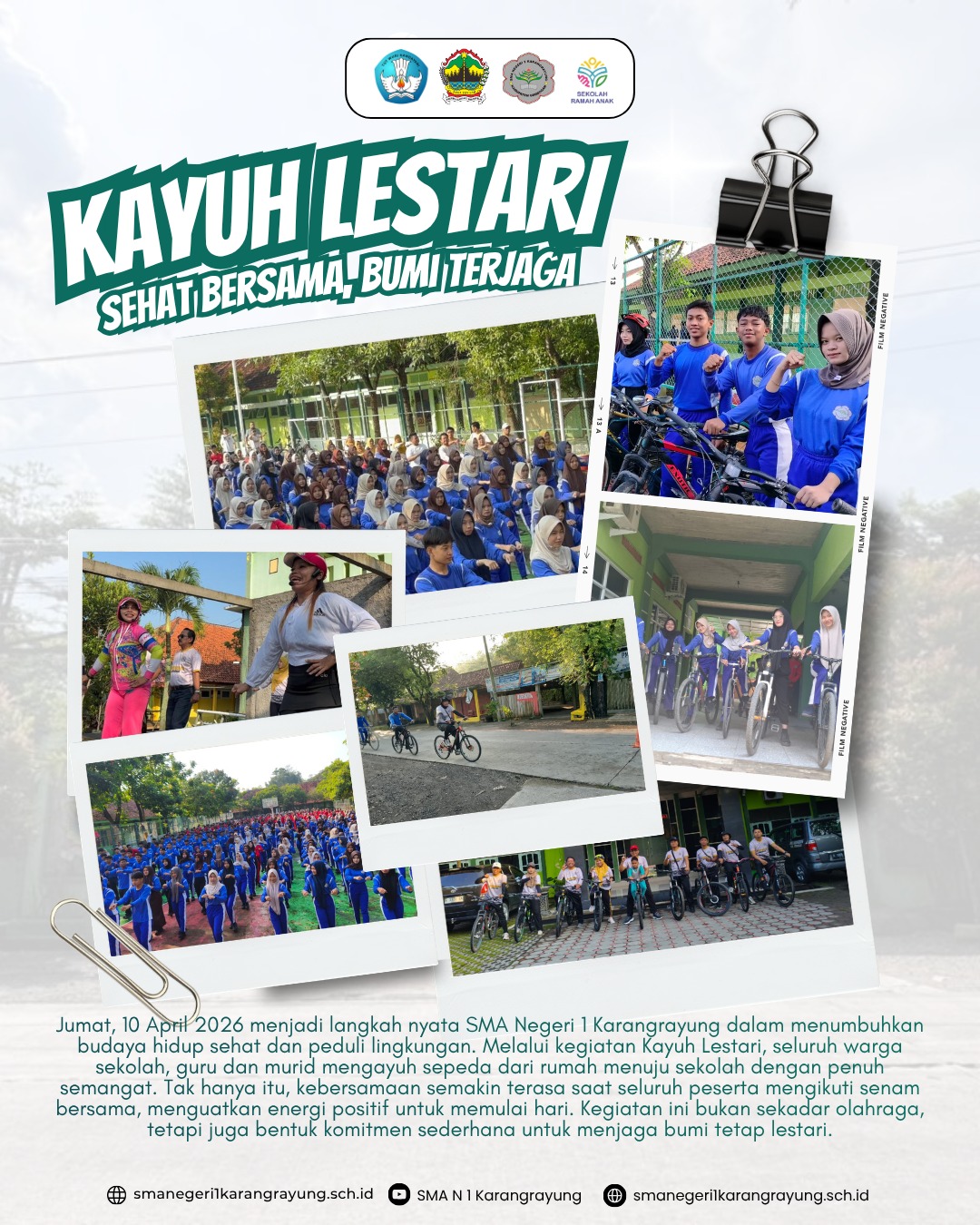 Jumat, 10 April 2026 menjadi momentum penting bagi SMA Negeri 1 Karangrayung dalam menanamkan nilai hidup sehat sekaligus kepedulian terhadap lingkungan. Melalui kegiatan bertajuk Kayuh Lestari, seluruh warga sekolah—baik guru maupun siswa—berpartisipasi aktif dengan mengayuh sepeda dari rumah menuju sekolah dengan penuh semangat dan kebersamaan. Kegiatan ini tidak hanya menjadi sarana olahraga, tetapi juga wujud nyata komitmen sekolah dalam mengurangi polusi dan membangun kebiasaan ramah lingkungan. Setibanya di sekolah, rangkaian kegiatan dilanjutkan dengan senam bersama yang diikuti dengan antusias oleh seluruh peserta, menciptakan suasana yang sehat, ceria, dan penuh energi positif.
