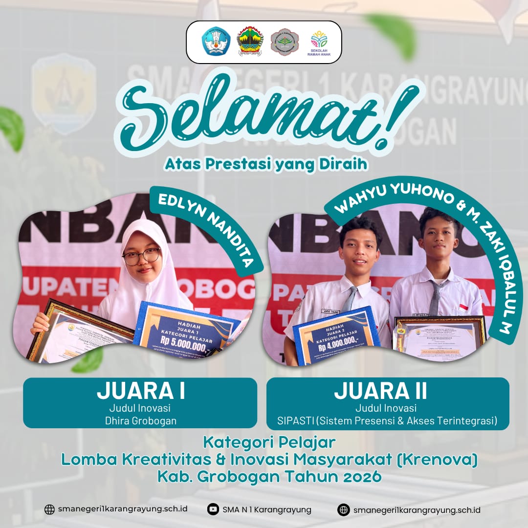 Pada tanggal 31 Maret 2026, SMA Negeri 1 Karangrayung kembali menorehkan prestasi membanggakan dalam ajang Lomba Kreativitas dan Inovasi Masyarakat (Krenova) tingkat Kabupaten Grobogan tahun 2026. Dalam kompetisi yang diikuti oleh berbagai inovator muda dari seluruh wilayah Kabupaten Grobogan tersebut, siswa-siswi SMA N 1 Karangrayung berhasil menunjukkan kualitas, kreativitas, serta daya saing yang luar biasa.