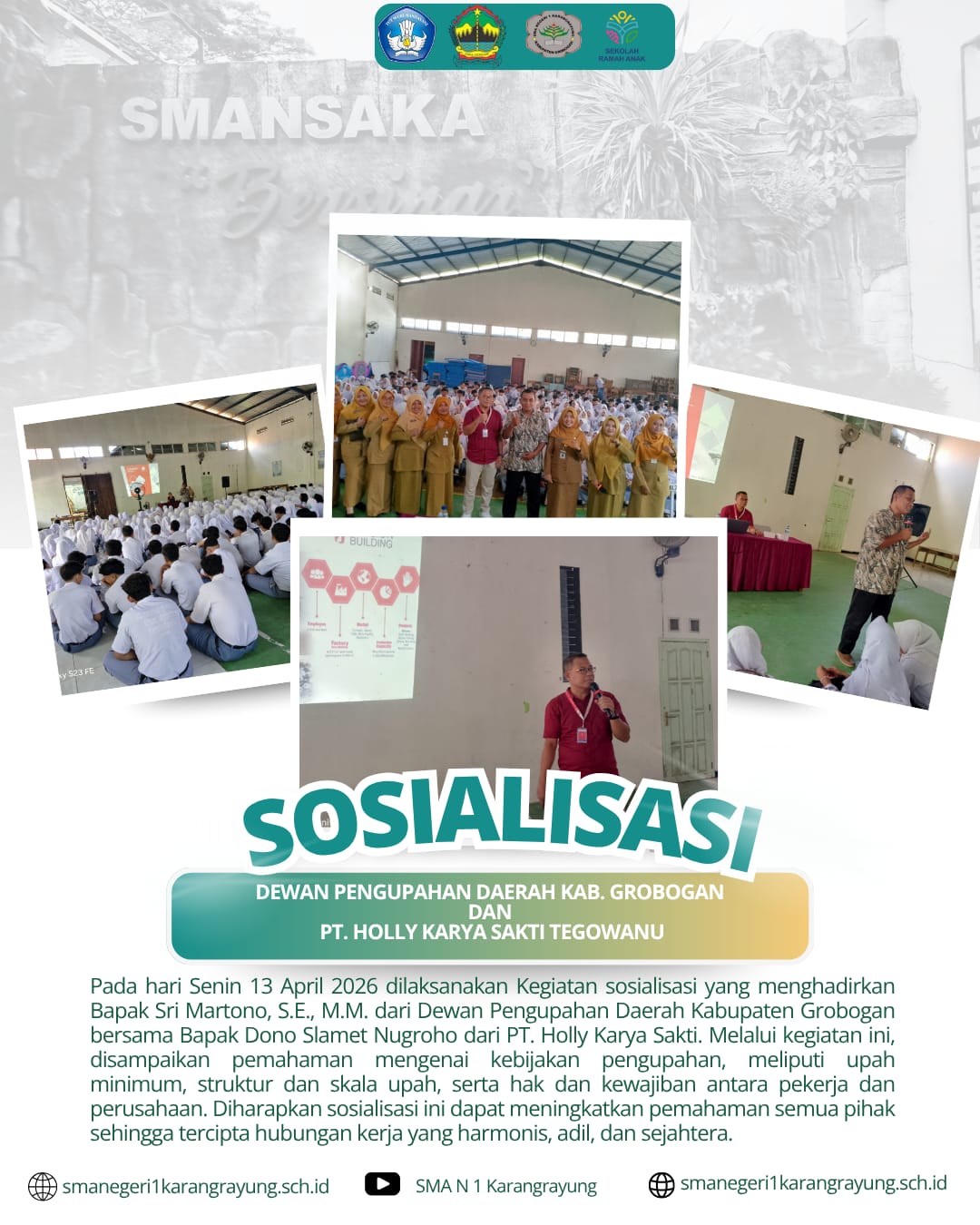 Pada hari Senin, Selasa, Rabu, dan Jumat (13 hingga 17 April 2026), SMA Negeri 1 Karangrayung, telah melaksanakan kegiatan sosialisasi bursa kerja bagi para siswa kelas XII. Adapun narasumber didatangkan langsung dari PT Holi Karya Sakti Tegowanu (garment), PT. Karya  Podomoro Grup Danyang (pabrik rokok), PNM cabang Karangrayung, dan PT. Pungkook Wirosari (tas kulit eksport). Kegiatan ini ditujukan agar para siswa setelah lulus nanti mempunyai gambaran tentang dunia kerja, dan memberikan peluang bagi para alumni yang tidak melanjutkan kuliah,  untuk bekerja di perusahaan-perusahaan terkait. SMA Negeri 1 Karangrayung juga membuat MoU terkait lapangan pekerjaan bagi para alumni, agar masa depan mereka lebih terjamin. Sewaktu para alumni bekerja di perusahaan-perusahaan tersebut, apabila akan bekerja sambil kuliah, juga akan diberikan waktu. Semoga kerjasama SMAN 1 Karangrayung dengan dunia industri, akan memberikan dampak positif bagi para alumni yang tidak melanjutkan kuliah.