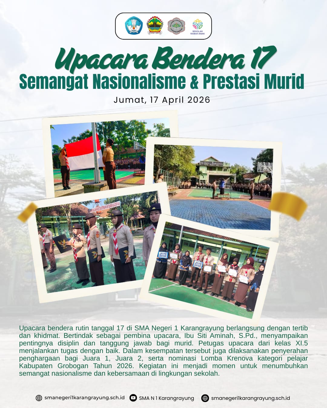 SMA Negeri 1 Karangrayung telah melaksanakan upacara bendera pada hari Jumat/17 April 2026. Upacara dilaksanakan di halaman sekolah, dengan pembina upacara Ibu Siti Aminah, S.Pd. Si. Peserta upacara dari semua guru dan tendik, serta semua siswa kelas X dan XI. Upacara berjalan dengan hidmat.