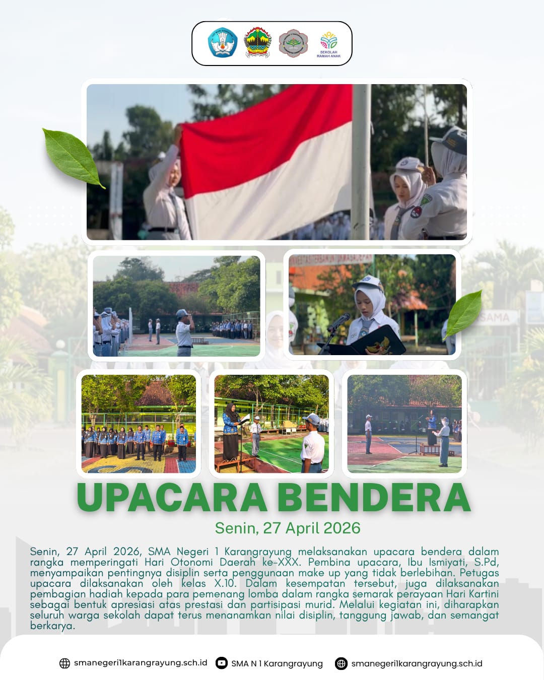 Hari Senin/27 April 2026, telah dilaksanakan upacara bendera di SMA Negeri 1 Karangrayung Kabupaten Grobogan, dalam rangka memperingati Hari Otonomi Daerah XXX Tahun 2026. Seluruh ASN mengenakan baju KORPRI lengkap. Adapun tema dari Hari Otonomi Daerah XXX Tahun 2026 adalah Wujudkan Otonomi Daerah Berkelanjutan dan Pelayanan Publik yang Prima. Upacara diikuti oleh semua siswa, guru, dan tendik. Nampak, suasana upacara yang khidmat selama berlangsung. Setelah upacara, dilaksanakan pembagian penghargaan kejuaraan lomba-lomba guru, tendik, dan siswa dalam rangka memperingati Hari Kartini, 21 April 2026.